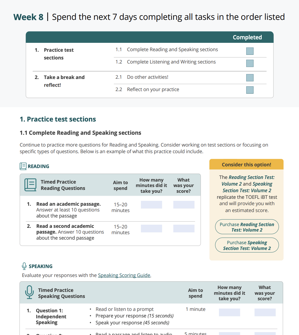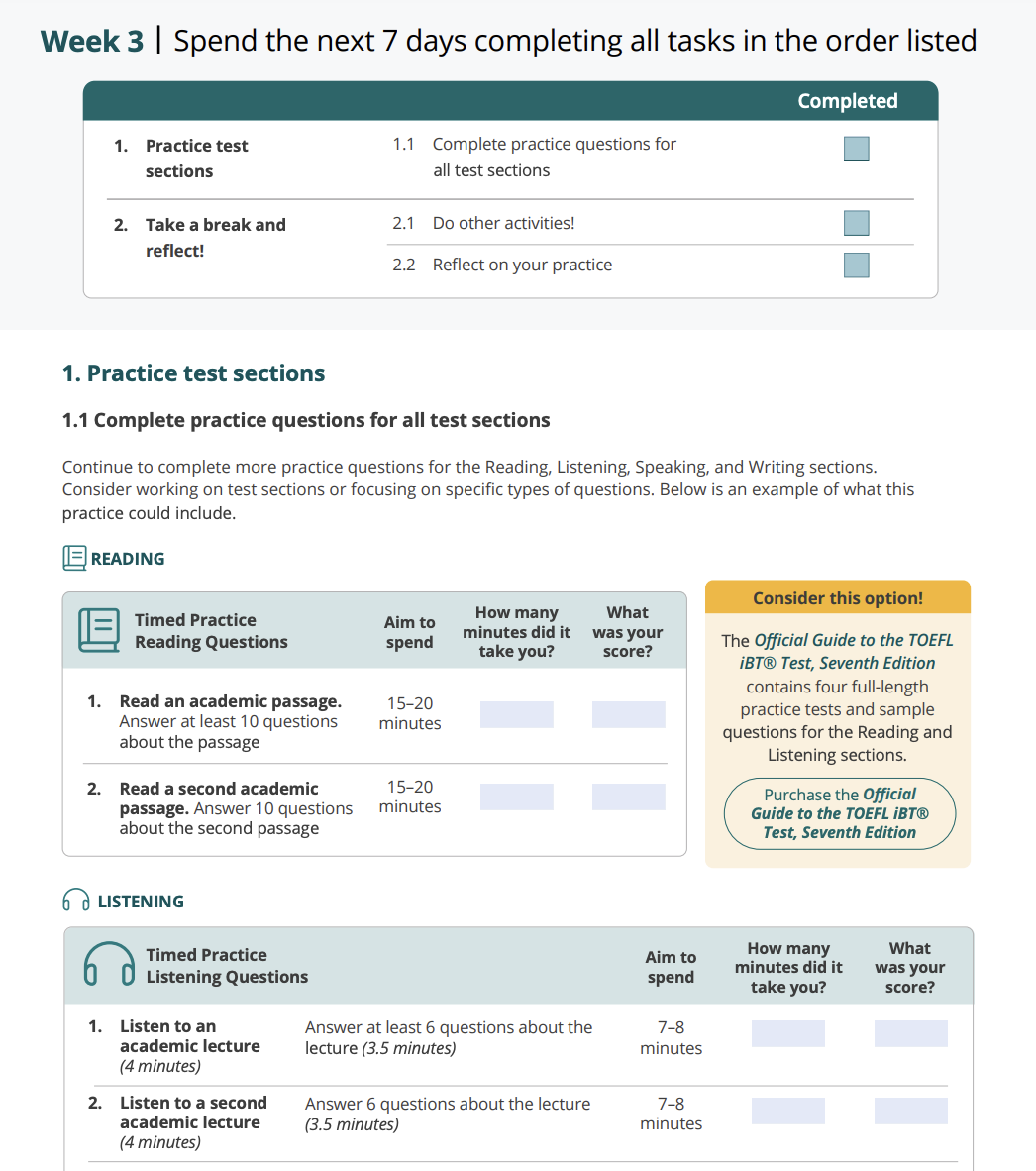 這是全英文的托福官方備考資源網站,原先名為TOFEL GO新版改名為Test Ready。 既然是官方資源,那資料就一定是最正確的!本身是免費的資源,只需要註冊帳號,我覺得內容也十分完善,裡面很詳盡地從認識托福考試開始,再到認可國家學校介紹、制定學習計畫、如何準備托福考試、托福考試當天以及托福成績。