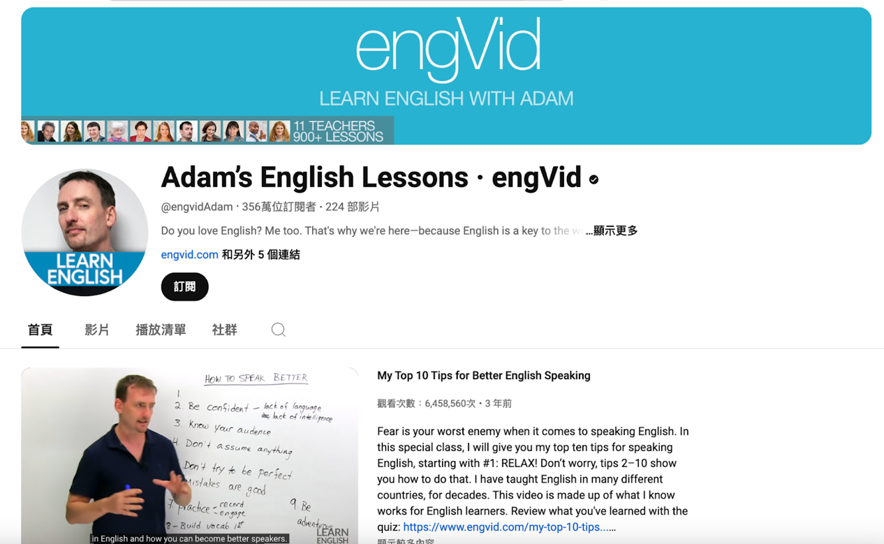 這個擁有350幾萬訂閱的Adam老師,頻道裡除了有大量的英文學習技巧外,也有針對托福、雅思、SAT幾個英文考試的考試技巧及建議。