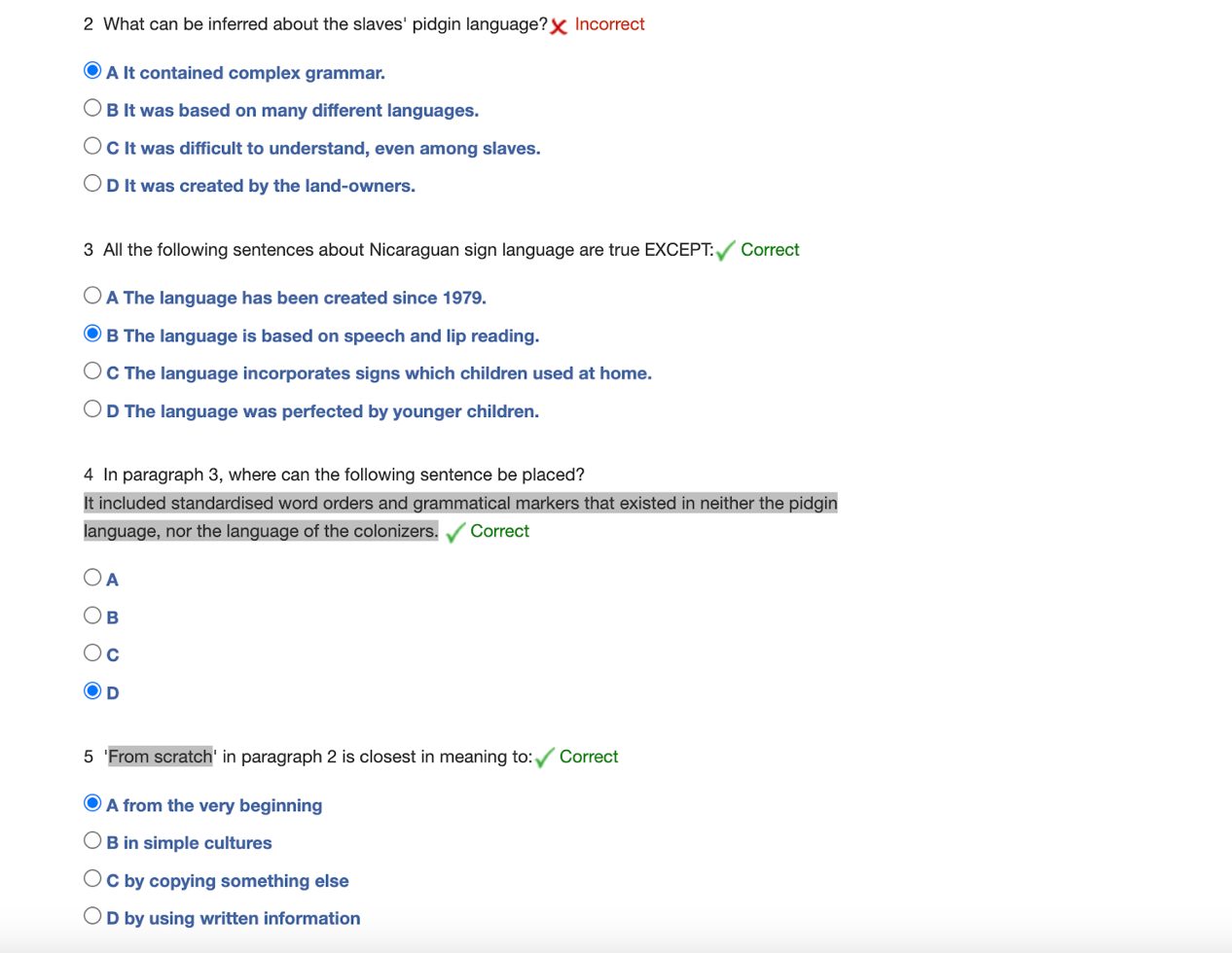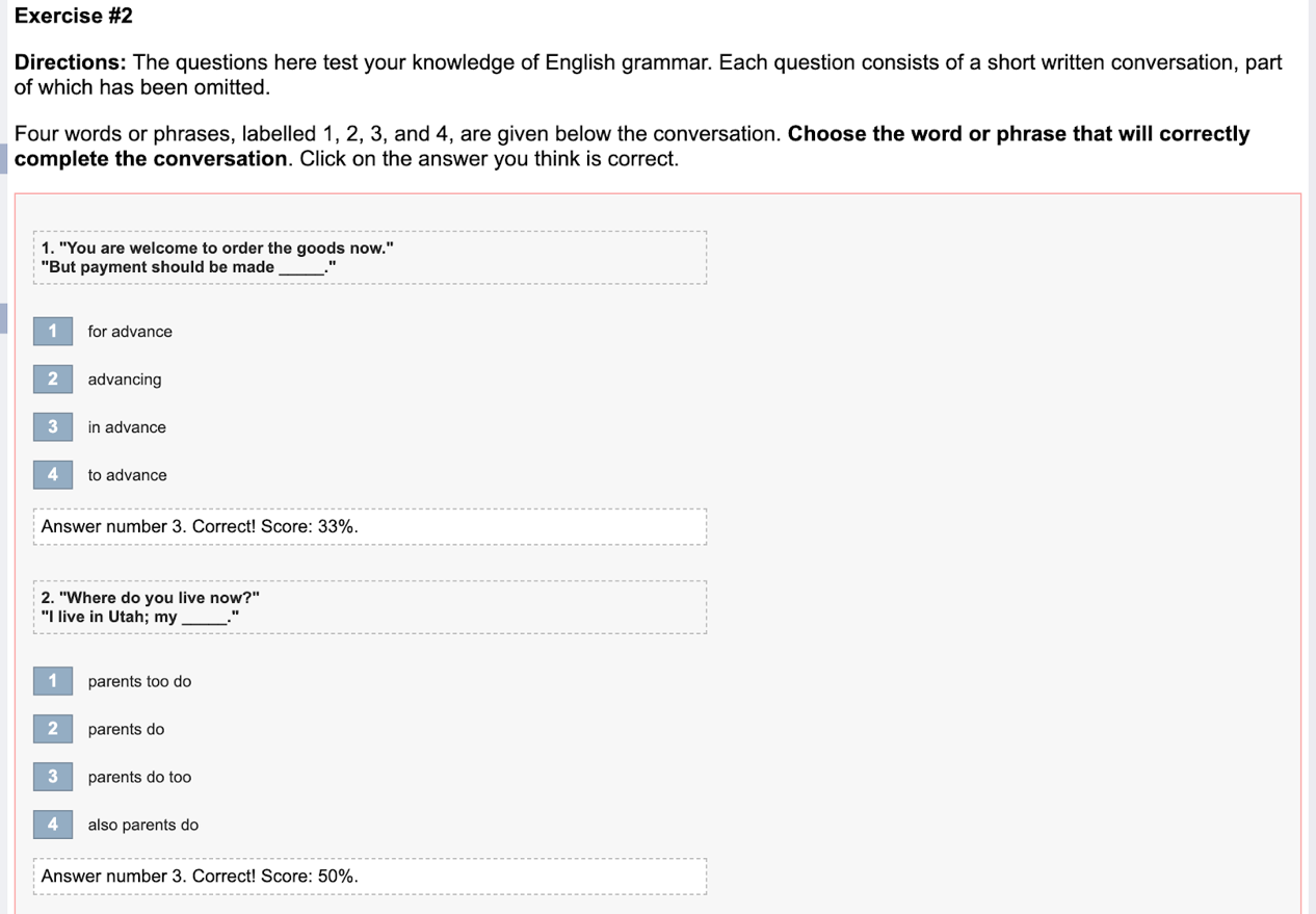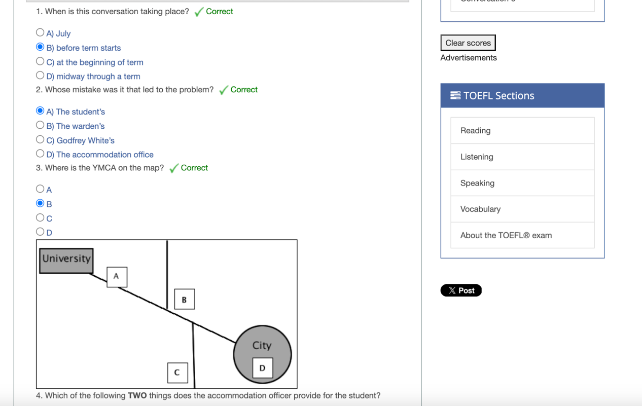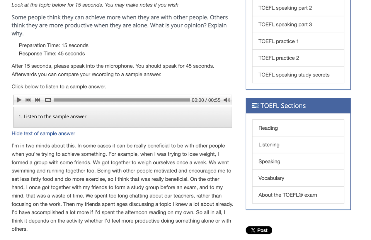 閱讀及聽力部分,答題時會直接顯示你選擇答案的正確與否,口說部分的話無法做實際上的評分,但有附上參考的回答。Exam English本身是免費資源網站,所以也算是準備托福考試時不錯的乾貨網站。