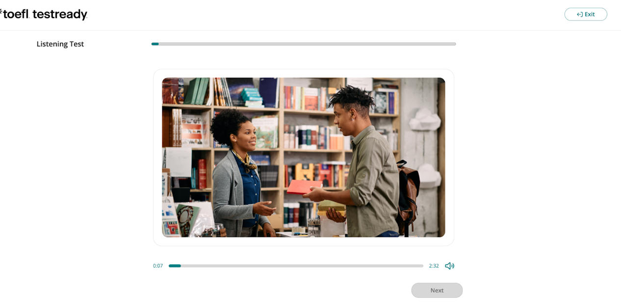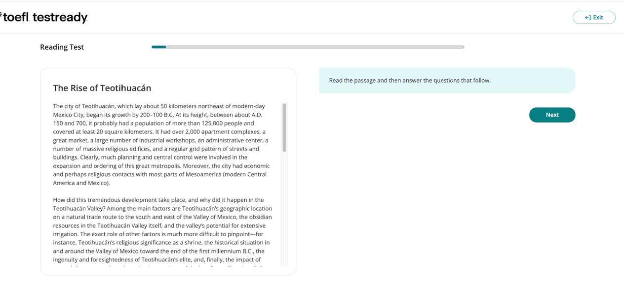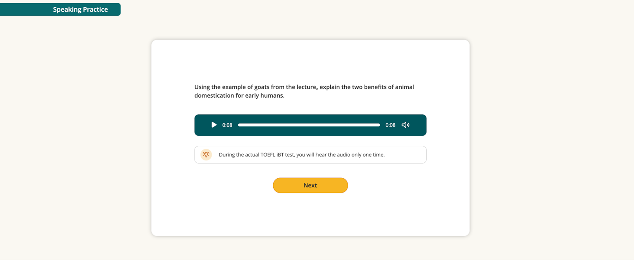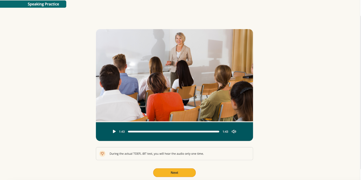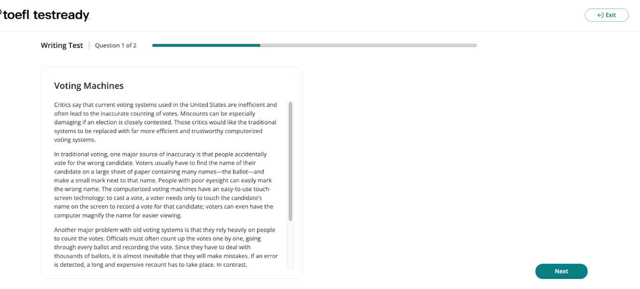 透過托福TestReady可以體驗完整版托福iBT考試練習題,模擬練習題跟正式考試不同的地方是,它僅會採用AI人工智慧自動評分,同時具備針對4個考試部分的表現來給予回饋。針對寫作和口說兩個區塊,托福TestReady推出了個人化回饋和答案建議。