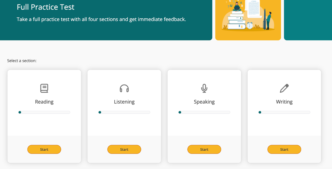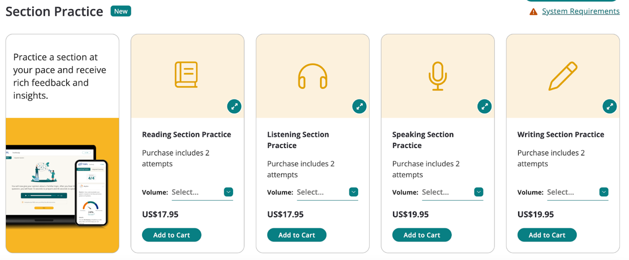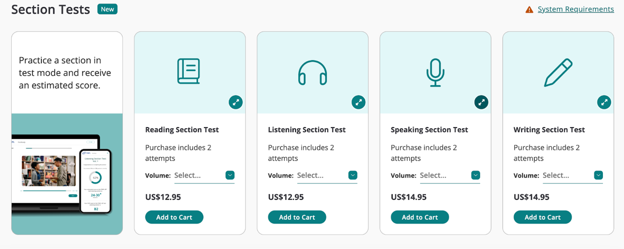 除了TPO外,TestReady也有推出單項的模考及練習,閱讀及聽力是相同價格,口說及寫作是相同價格,讓你可以針對弱點科目來做練習,單科模考則會給予托福預估分數及CEFR等級。在寫作及口說的部分也會提供回饋,讓你可以更有效地做強化。