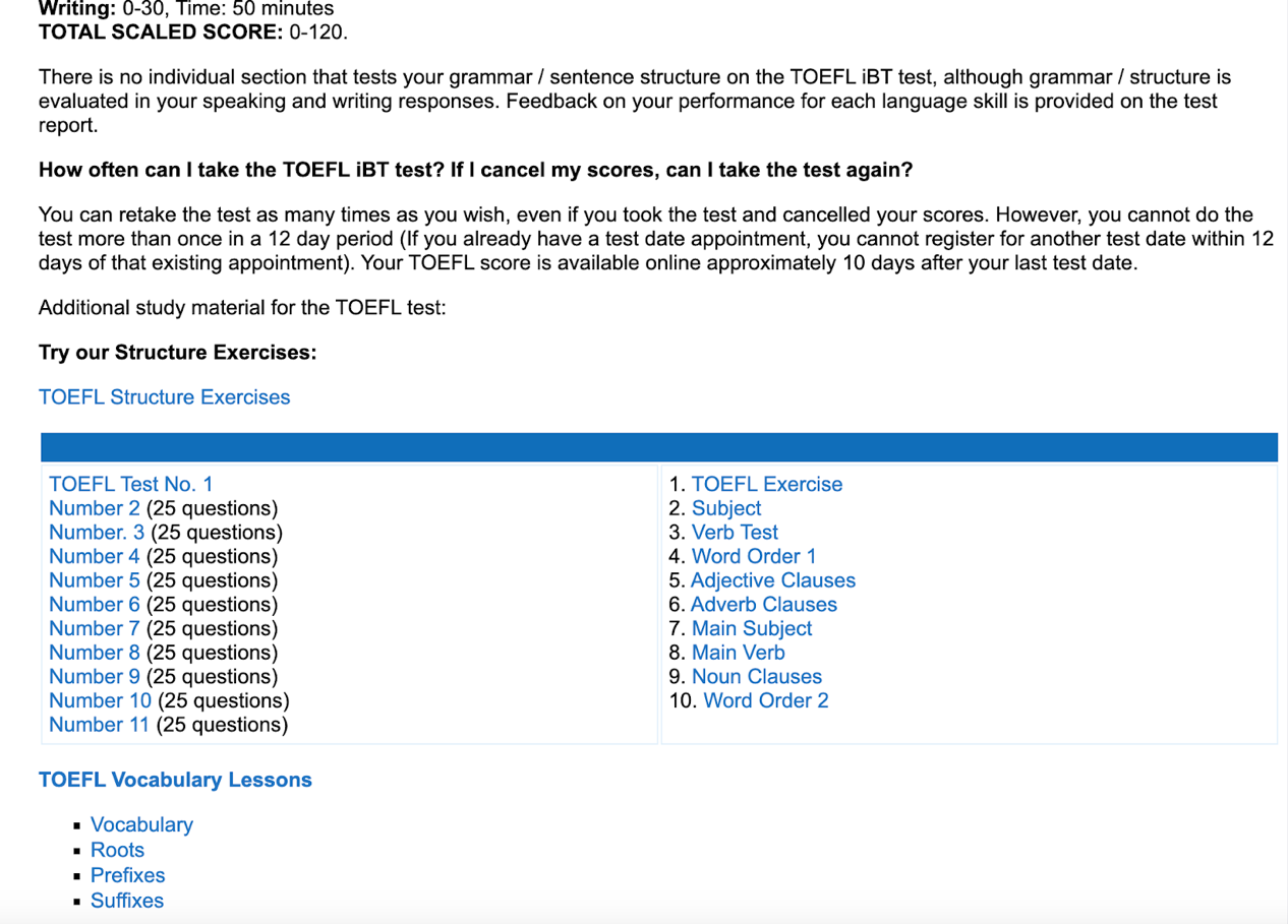 這個網站看起來雖然陽春,但是也是免費的資源型網站。裡面有針對托福這個考試的文字介紹,透過網站可以瞭解托福考試的結構及評分標準等等。當然也有免費的考試試題可以做練習,答案會在答題時直接顯示出來。