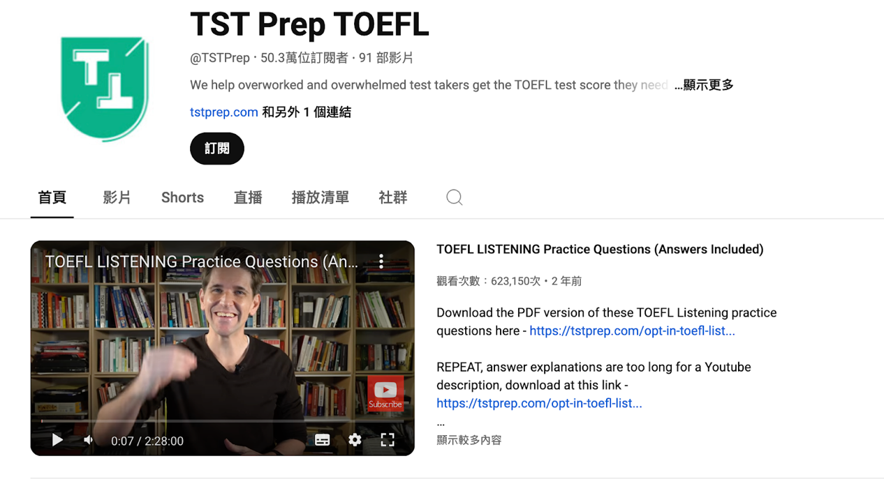 專門介紹托福考試的Youtube頻道,內容深入淺出,適合每個水平的學生來看。頻道裡面也提供了許多聽說讀寫相關的準備指南跟考試技巧,也有針對模擬試題的講解分析。每支影片時長都很長,真的算是非常實用的托福頻道。