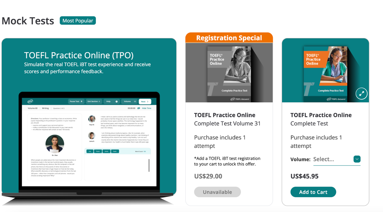 TestReady除了免費的模擬練習外,也有推出付費版的模擬考題,也就是TOEFL Practice Online(TPO),透過TPO可以讓你模擬真實的iBT考試,內容包含歷年的考題,而且很快速就知道分數,聽力及閱讀可以即時評分,口語及寫作會在24小時內給予反饋。