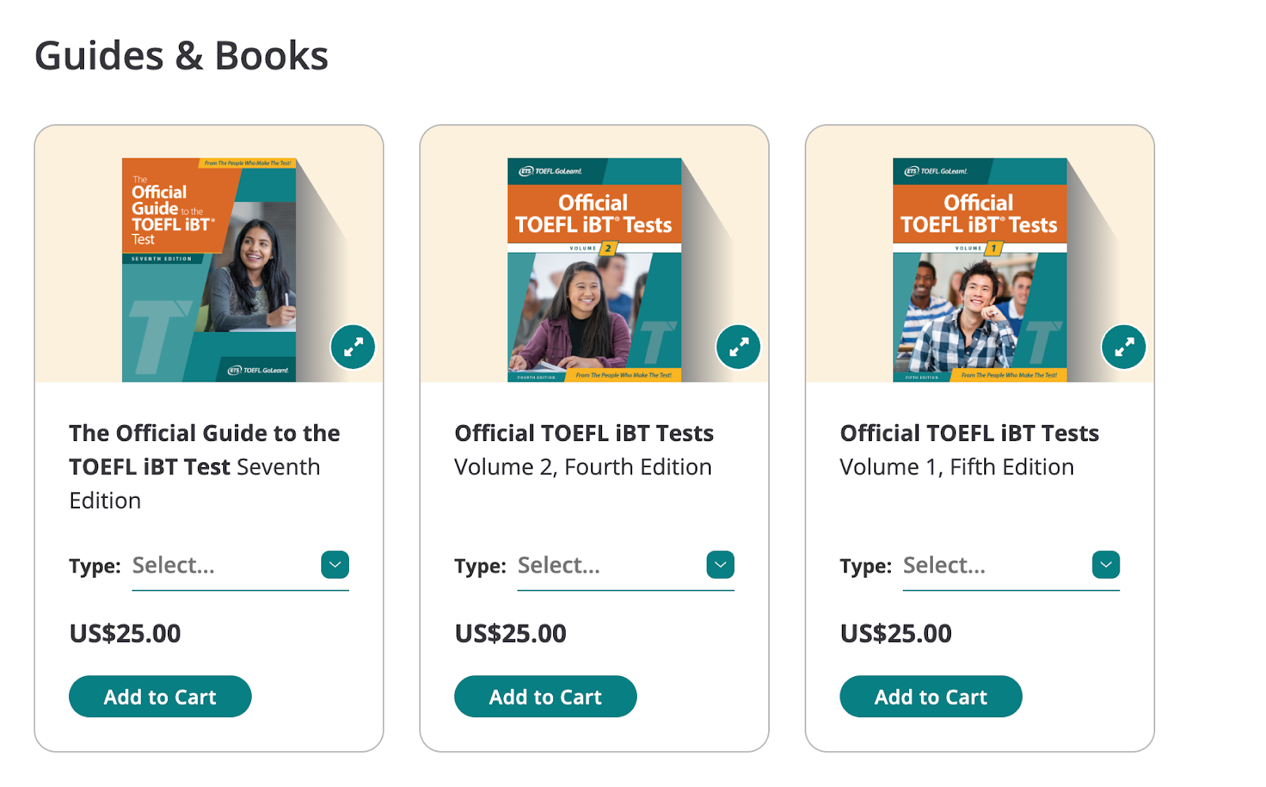 除了模考及練習題外,TestReady也有販售官方備考資料:像是一些指南跟考古題等等。