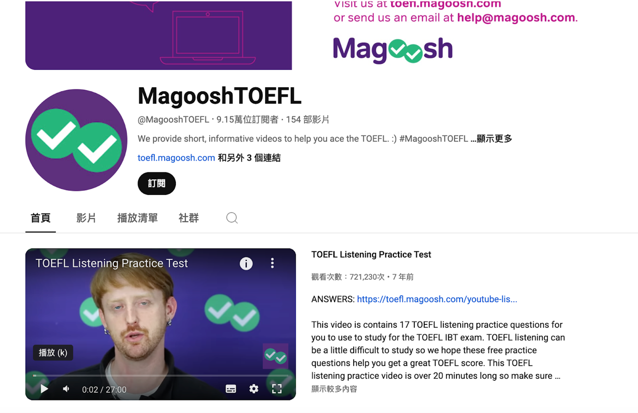 雖然本身MagooshTOEFL網站需要收費,但是他們的Youtube頻道,還是有提供不少托福考試的備考影片,也有針對聽說讀寫不同部分的應試技巧。