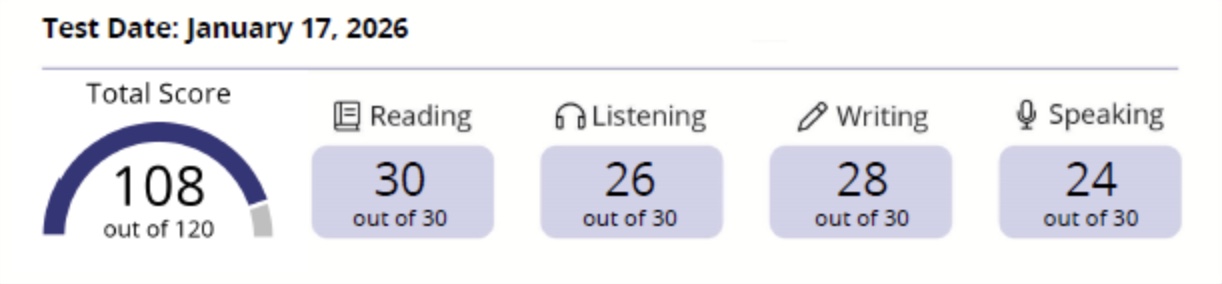 在正式開始準備 TOEFL 之前,我曾到字神參加模考,當時的成績只有 58 分。即使經過一段時間的課程訓練,在正式考前一個禮拜的模考也只有 88 分,老實說,那時我並不覺得自己已經準備好。 但回頭看,這段過程讓我明白一件事:模考成績並不等於你的上限,而是提醒你該怎麼調整方向。在字神課程中學到的解題觀念、答題架構與思考方式,其實早已慢慢內化,只是需要在正式考試的環境中,一次完整地發揮出來。 最後能在正式考試中拿到 108 分,並不是因為奇蹟,而是因為在低分、焦慮與不確定中,仍然選擇相信正確的方法,持續累積實力。 想對正在努力,或正準備踏上留學考試這條路的你說:不要被某一次成績定義自己,只要方向對,進步一定會在你不經意的時候出現。