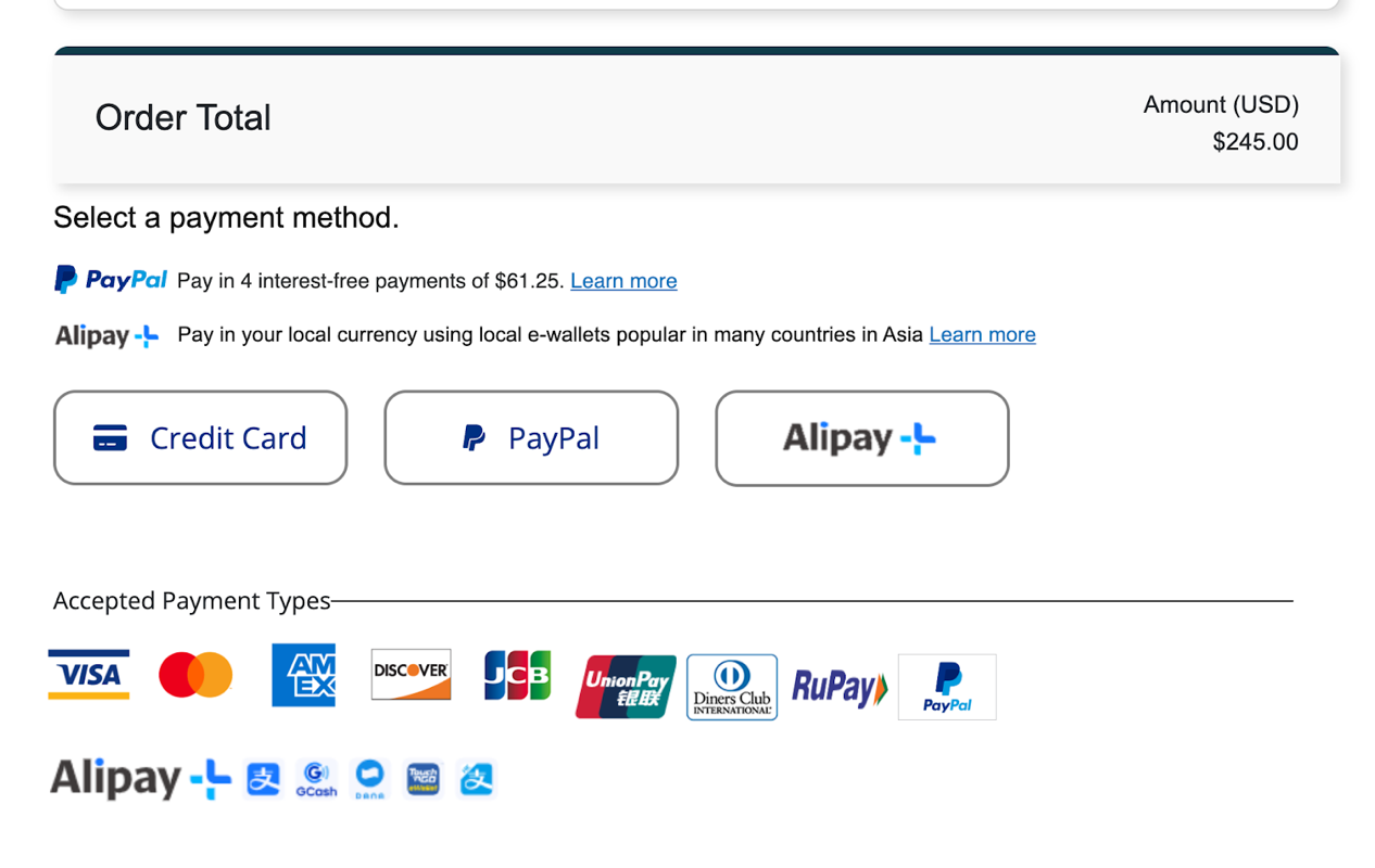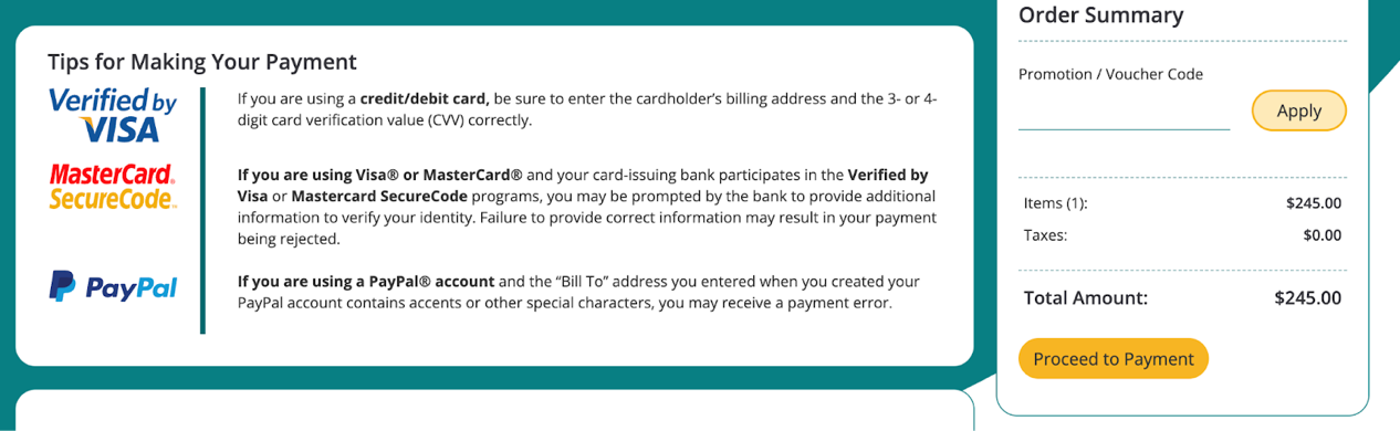 再次確認完報名資訊無誤後,就可以進入付款頁面,可使用信用卡、Paypal付款,如果有折扣碼也可以在這區塊輸入後送出。