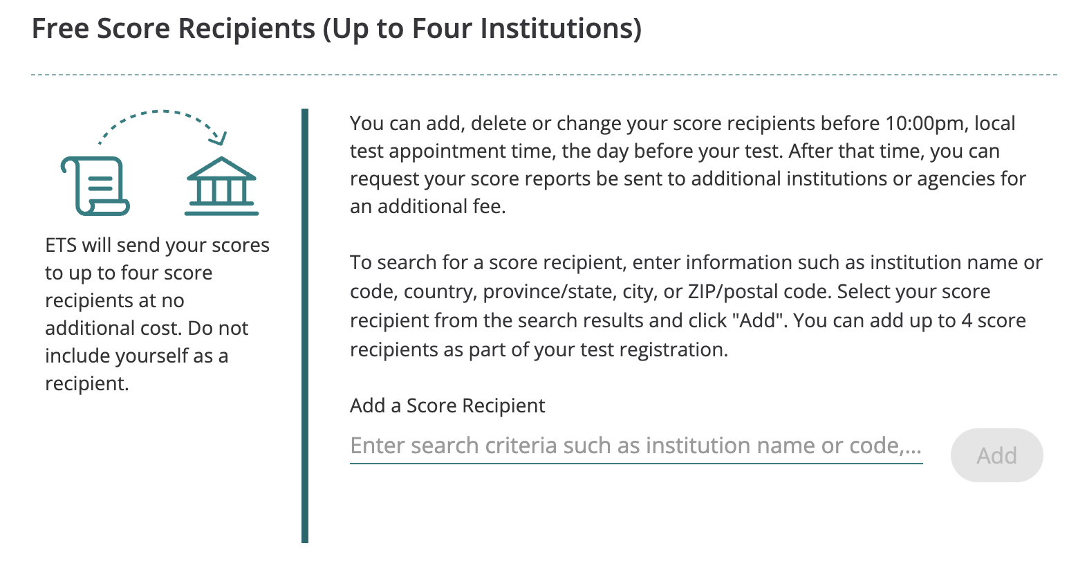 多數申請美國學校都會需要Request official score report,就是請ETS直接幫你把考試成績寄給申請學校,才算是正式成績。加發成績每一間學校費用為美金20元。